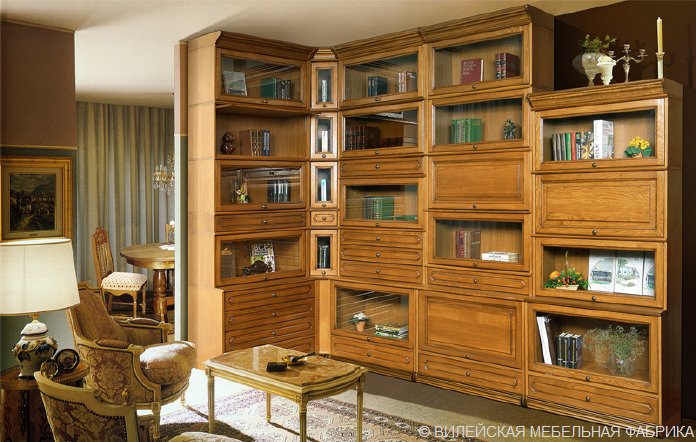 Модульная программа Вилия-Н, библиотека. Домашняя мебель. Фасад из массива дуба. Корпус шпонированная ДСП. Большой выбор элементов. Красители пмп, дв.Срок выполнения заказа 45 дней. Производитель ЗАО Молодечномебель. Беларусь, Вилейская мебельная фабрика.