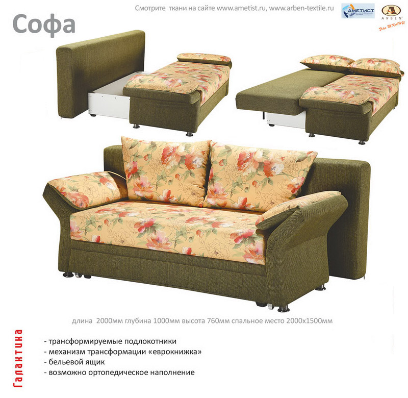 Софа Механизм трансформации дивана Еврокнижка. Внутреннее наполнение; пружинный блок, ткань «Спанбонд», ППУ, войлоксинтепон и наполнитель «Сорель». Спальное место. 2000*1500 Мебель соответствует ГОСТ 19917-93, гарантия 18 мес. Подушки - с/пух со съемными чехлами. Каркас двуспального дивана изготовляется из экологически чистых материалов различных пород древа и мебельной фанеры, снабжен большим ящиком для белья с березовыми направляющими. Подлокотники дивана с двумя фиксированными положениями. Бельевой ящик оснащен вентиляционными отверстиями. Гарантия 18 месяцев.