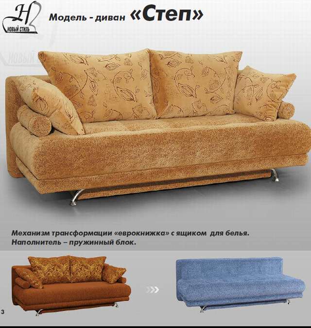| Ближайшие по цене товары данной группы |  | | Бета 4 Механизм трансформации дивана: ЕВРОКНИЖКА «тик-так» (шагающий). Каркас: деревянный (сосна), ДВП, шлифованная высокосортовая фанера. Есть бельевой ящик. Наполнителем дивана служат: независимый пружинный блок или ППУ. Характеристики пружинного блока: (Независимый, диаметр пружин - 50 мм. покет, 260 пружин на м2.) Каркас ящика бельевого – выполнен из шлифованной высокосортовой фанеры, а не из ДСП. Ткани для обивки дивана в широком ассортименте. Чехол съёмный – нет. Габаритные размеры спального места 190см х 147см. Диван может комплектоваться креслами. Реальный размер дивана может отличаться на 1 - 2 см. В комплекте большие со съемными чехлами подушки. | | |  | | Агат Современный элегантный дизайн. В этой модели применены блоки независимых пружин «pocket springs», обладающие уникальными анатомическими свойствами и делают отдых не только комфортным, но и здоровым. Надежен и удобен в действии механизм трансформации — «еврокнижка». Под сиденьем дивана размещается вместительный бельевой ящик из ламината. Оригинальной формы подушки спинки и подлокотников выполнены съемными. Богатый ассортимент обивочных тканей предоставляет широкий выбор вариантов декоративного оформления | | |  | | Анастасия 1 Диван Анастасия 1 Механизм раскладки дивана Еврокнижка. Наполнение Пружинный блок. Диван имеет большой, удобный, вместительный ящик для белья. Цена дана в первой категории ткани. | | |  | | Бета 3 Механизм трансформации дивана: ЕВРОКНИЖКА «тик-так» (шагающий). Каркас: деревянный (сосна), ДВП, шлифованная высокосортовая фанера. Есть бельевой ящик. Наполнителем дивана служат: независимый пружинный блок или ППУ. Характеристики пружинного блока: (Независимый, диаметр пружин - 50 мм. покет, 260 пружин на м2.) Каркас ящика бельевого – выполнен из шлифованной высокосортовой фанеры, а не из ДСП. Ткани для обивки дивана в широком ассортименте. Чехол съёмный – нет. Габаритный размер дивана: 193см плюс 33 см. подлокотники, размеры спального места 193см х 148см. Диван может комплектоваться креслами. Реальный размер дивана может отличаться на 1 - 2 см. В комплекте большие со съемными чехлами подушки. | | |